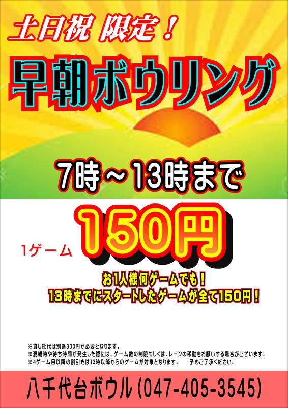 土日祝限定、7時〜13時の間、1ゲームが150円!